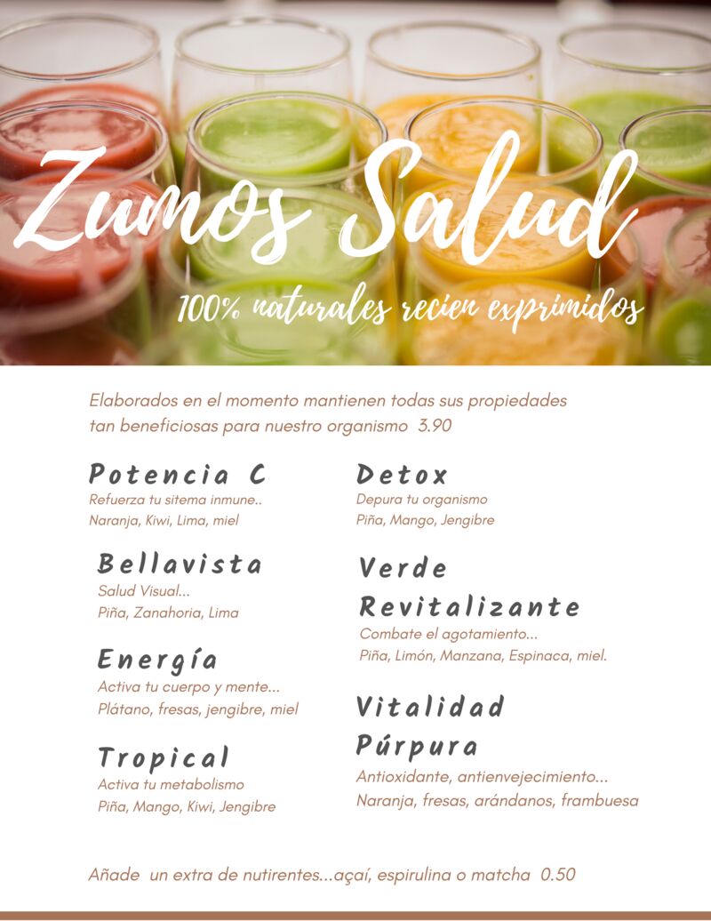 Completa tu menú perfecto con uno de nuestros fabulosos Zumos Salud exprimidos en el momento, cargados de vitaminas esenciales, 100% naturales, elígelos por tu salud y disfrútalos por su extraordinario sabor!!!